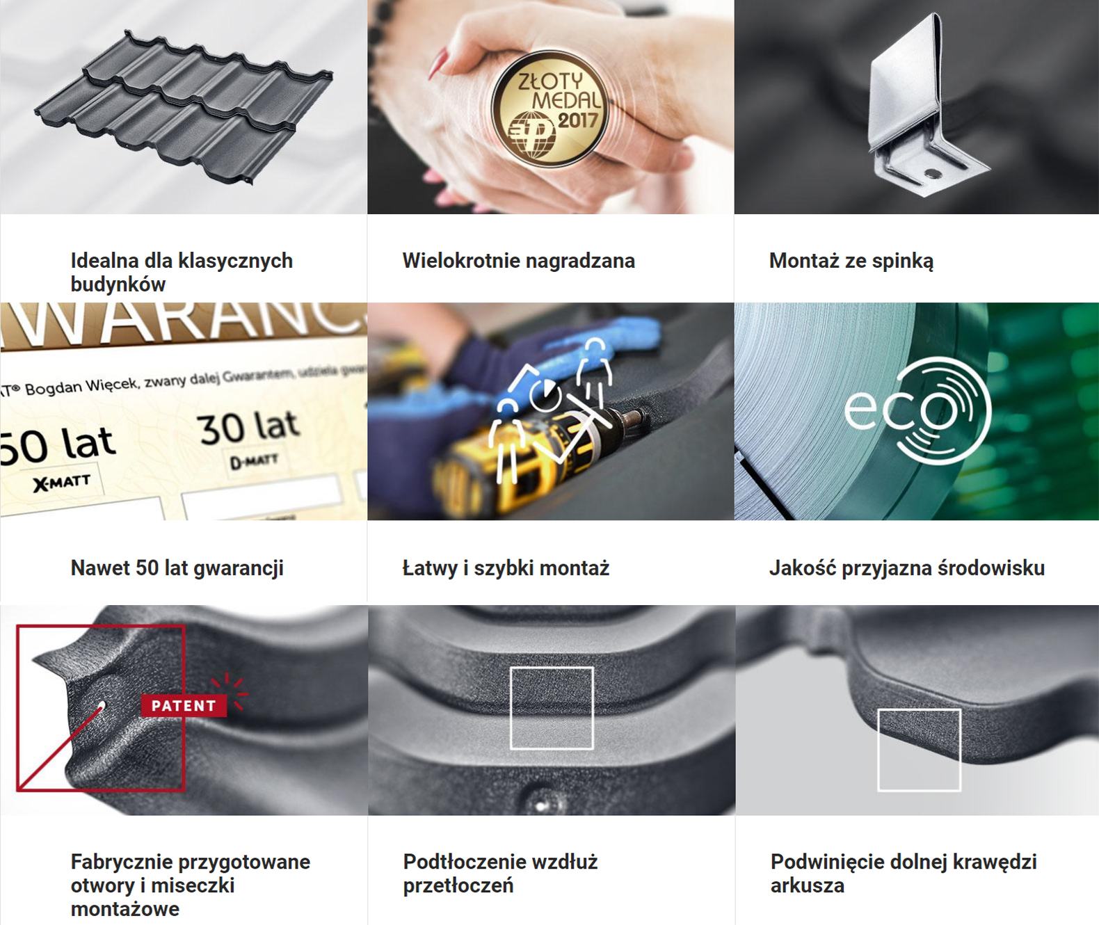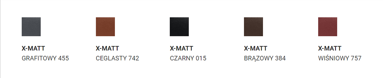 - X-MAAT - Powłoka produkowana przez szwedzką hutę o globalnym zasięgu – SSAB. Jako jedyni w Europie posiadamy pisemną gwarancję powtarzalności koloru od SSAB. Powłoka należy do kategorii powłok antykorozyjnych zgodnych z normą EN 10169. Gwarantuje ona bardzo długą żywotność produktu, wzmacnia odporność na zarysowania mechaniczne oraz promieniowanie UV. Wysoka odporność na korozję powłoki X-Matt została sprawdzona przez ekspozycję w agresywnych środowiskach morskich oraz przemysłowych. Powłoka cynku to min. 275 g/m². Trwałość i piękno to X-Matt.