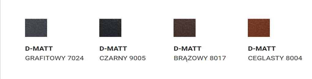 - D-MATT - Powłoka produkowana jest przez największego producenta stali na świecie - ArcelorMittal. Jako jedyni w Europie posiadamy pisemną gwarancję powtarzalności koloru od ArcelorMittal. Powłoka D-Matt to wysoka trwałość oraz odporność na korozję i zarysowania. Oto jej najważniejsze parametry techniczne: grubość powłoki dekoracyjnej: 35 mikronów; przyczepność powłoki (gięcie w T) : ≤ 1 T; odporność na pękanie przy zginaniu (gięcie w T) : ≤ 2 T; odporność na uderzenia: 18 J; odporność na zarysowanie (Clemen): ≥ 1,5 kg; odporność na korozję: Kategoria RC3; odporność na promieniowanie ultrafioletowe: test QUV (UVA + H2O) (2000 godzin). Powłoka cynku to min. 275 g/m². Jeśli szukasz dachu, który posiada piękną, matową oraz ziarnistą strukturę to D-Matt jest właśnie dla Ciebie.