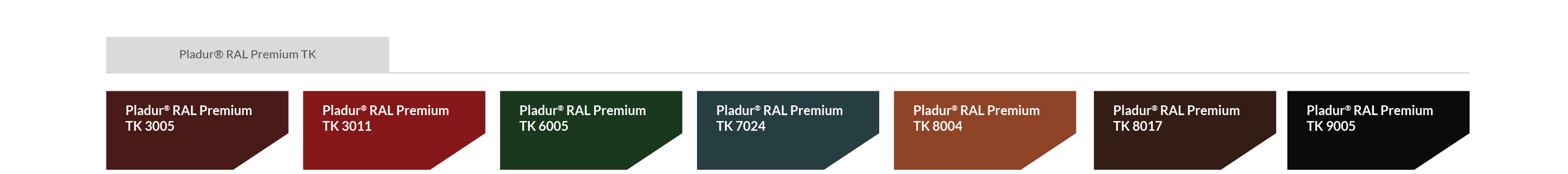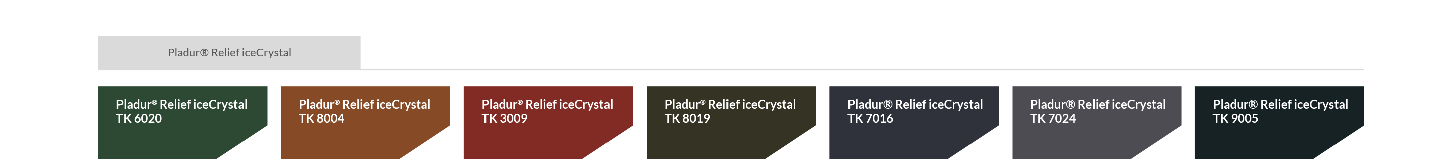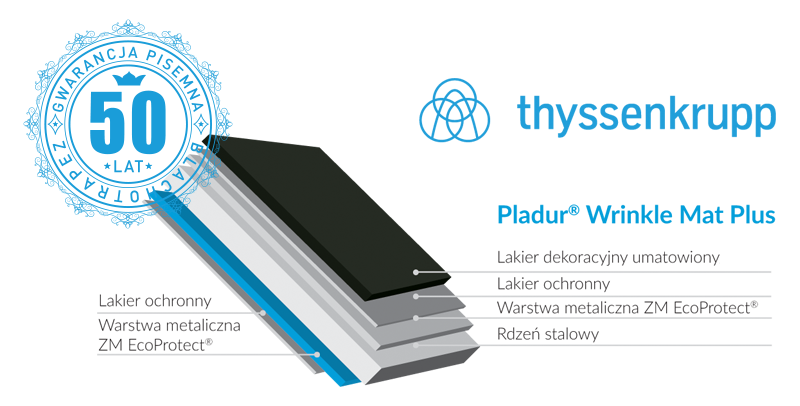 Pladur® Wrinkle Mat - gruboziarnisty, z kolorami wg znanych wzorców, system powlekania 2- warstwowy, grubość powłoki 35 mikronów Pladur® Relief iceCrystal - blachy z prawnie zastrzeżoną strukturą powierzchni imitującą wykwity zmrożonego lodu, system powlekania 3-warstwowy, grubość powłoki min. 36 mikronów Powłoka Zm EcoProtect - zmodernizowana i ulepszona powłoka metaliczna poprzez zastosowanie nowatorskiego stopu cynku i magnezu, zamiast dotychczasowej powłoki cynkowej. Posiada udoskonaloną ochronę i dłuższą żywotność. | |